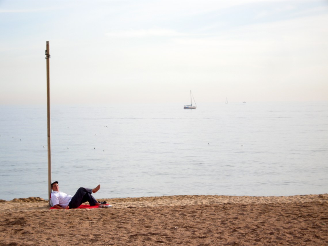 A las 12h en el Zurich, para bajar a la Barceloneta. No está todo perdido si puedes ver una franja dorada subrayando el mar, si el sol velado te templa el ánimo y los huesos, si hay ropa tendida y no es Nápoles.