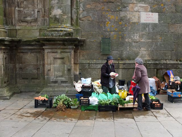 He paseado unas horas por Santiago de Compostela, rebosante de camelias en árboles cargados de flores como manzanas. Es verdad, la lluvia encera las calles, la piedra mojada le da al aire un olor mineral. En el mercado, a las vendedoras de berzas, grelos y patatas, campesinas que le han arrancado a la tierra la comida, se les ve una piel de fatigas. La humedad ha envuelto su cuerpo y su mirada, la fiereza les viene de a ras de suelo. He escuchado su acento suave y lamentoso, que arrastra un poco el adiós de las palabras.