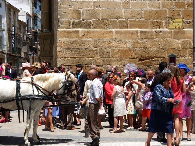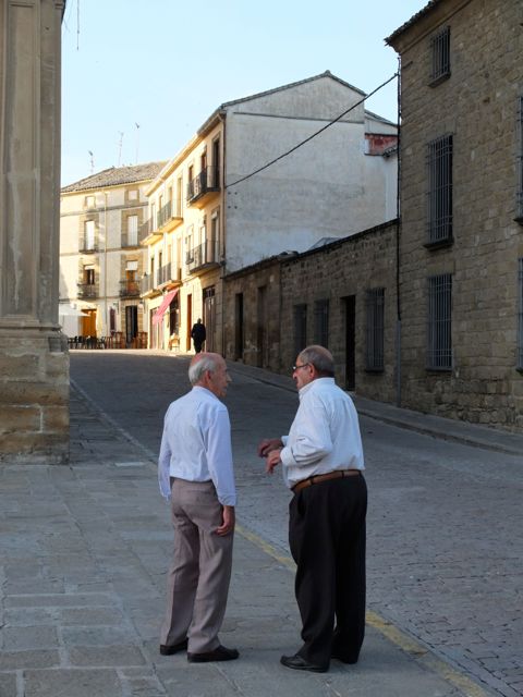 Hemos llegado a Úbeda tras tres horas de una Andalucía rubia, agostada. Sólo al final han aparecido las salpicaduras de los olivos sobre la tierra, en ristras, calculados para el aceite. Aquí también el cielo puede ser blanco, neblinoso. Aquí, destinados a un hotel de aires ficticios, nos sentimos un poco desproveídos, ante un paisaje mínimo. En las calles, los hombres van comentando y tienen que, a cada poco, detenerse para hablarse mejor, con las manos, con toda la atención que unos pasos sustraerían. Sorprendo otra boda en uno de mis vagabundeos, esta vez de novia flamenca revoloteada de colores, como corresponde a este lugar festivo, de gente dada a lo social. Mucha algarabía y muchos hombres desertando la iglesia antes de que siquiera dé comienzo la misa, bajando la rampa con las alas de sus chaqués y americanas al vuelo.